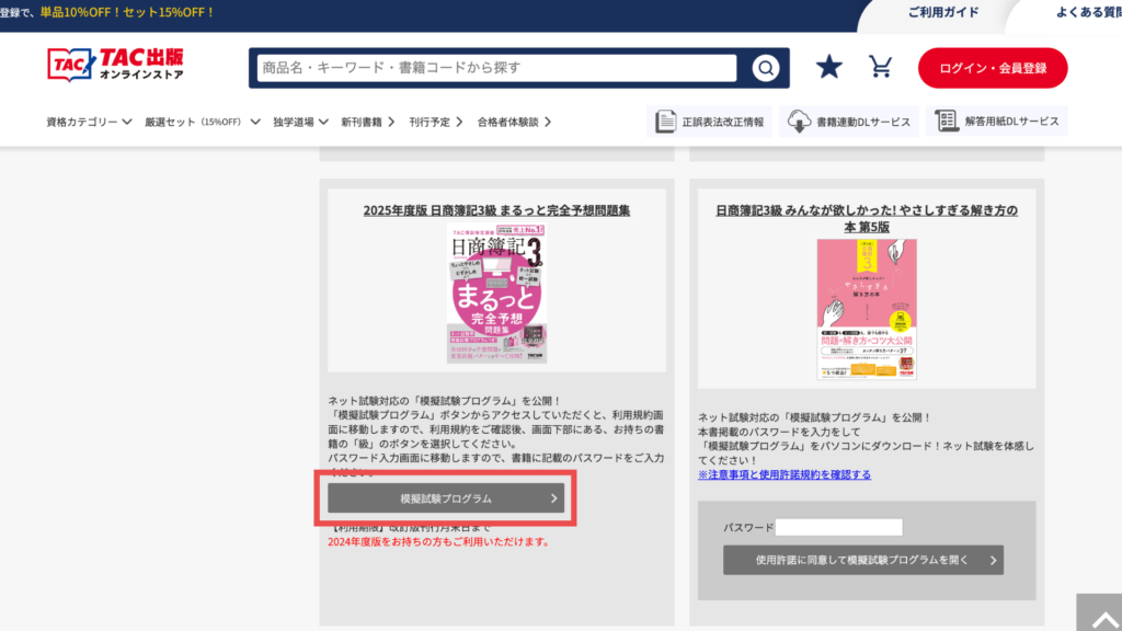 まるっと完全予想問題集の「模擬試験プログラム」をクリックします。