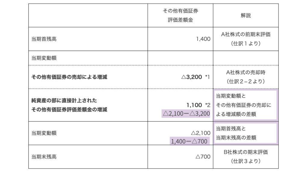 *1 その他有価証券の売却による増減:売却によって取り崩されたその他有価証券の価額が相当します。このとき、その他有価証券評価差額金は取得から売却までを通算した価額になります。