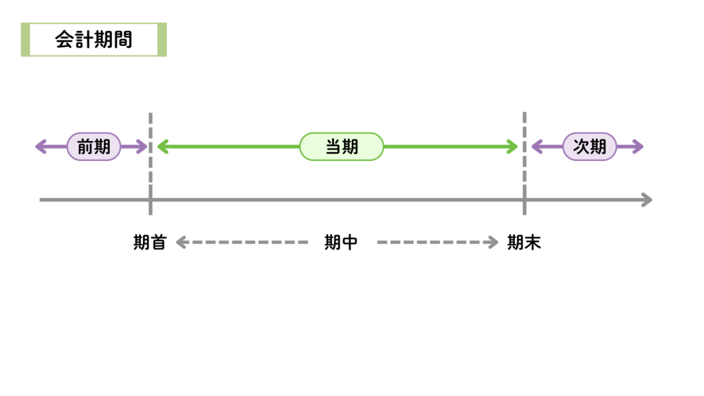 また、会計期間の始まりを期首、終わりを期末、期首から期末の間を期中といいます。
