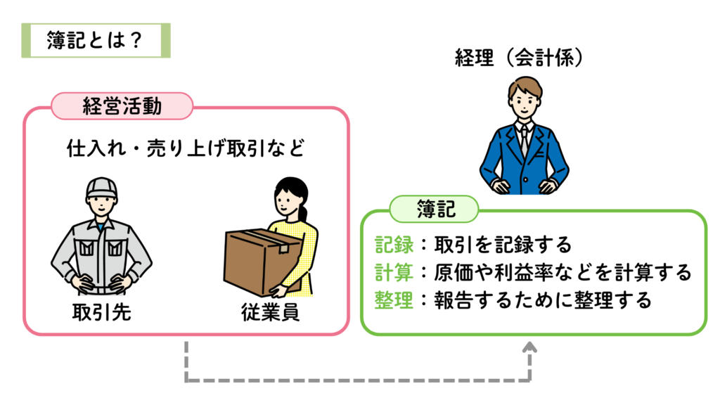 簿記とは「帳簿記入」の略で、日々の経営活動を記録・計算・整理して、利害関係者に報告するための技術のことです。
