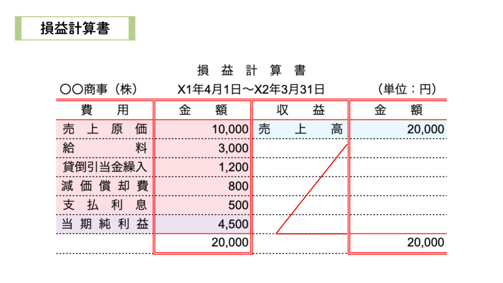 具体的な項目と数値を記入すると、損益計算書は次のようになります。