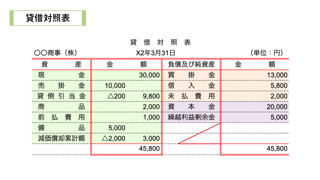 具体的な項目と数値を記入すると貸借対照表は次のようになります。