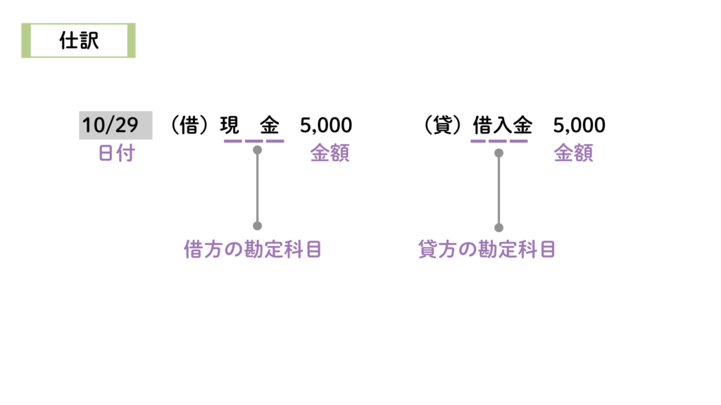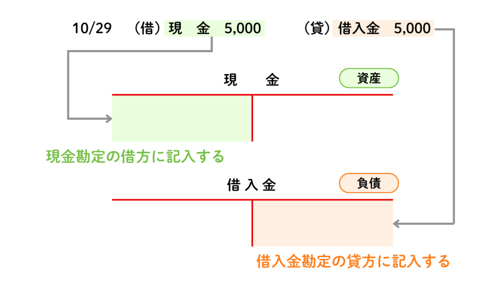 10月29日に銀行から5,000円を借り入れ、現金を受け取った。