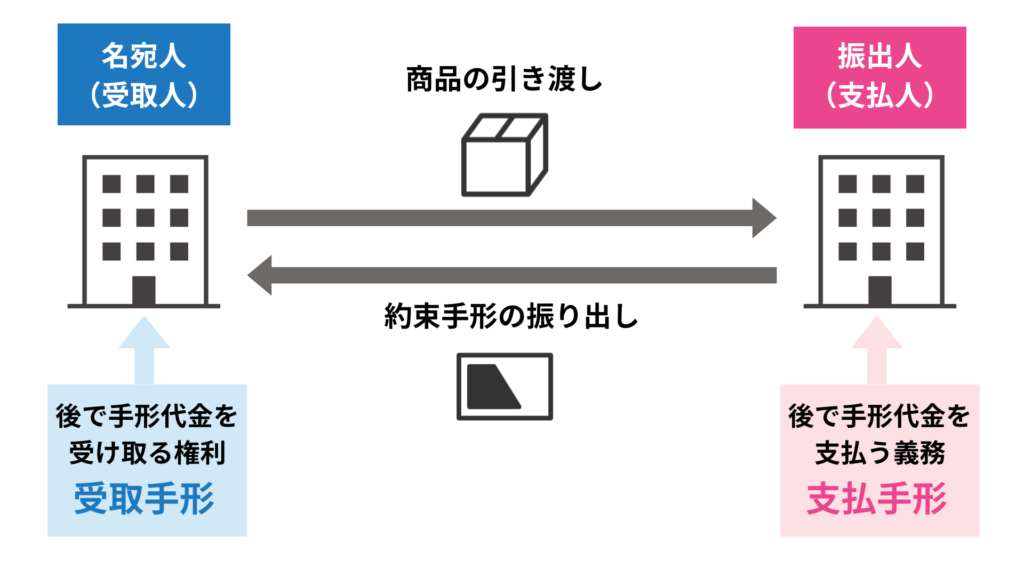 約束手形のやり取りによって、手形金額を受け取る権利を得る者(名宛人なあてにん)と、手形金額を支払う義務を負うもの(振出人ふりだしにん)が出てきます。
