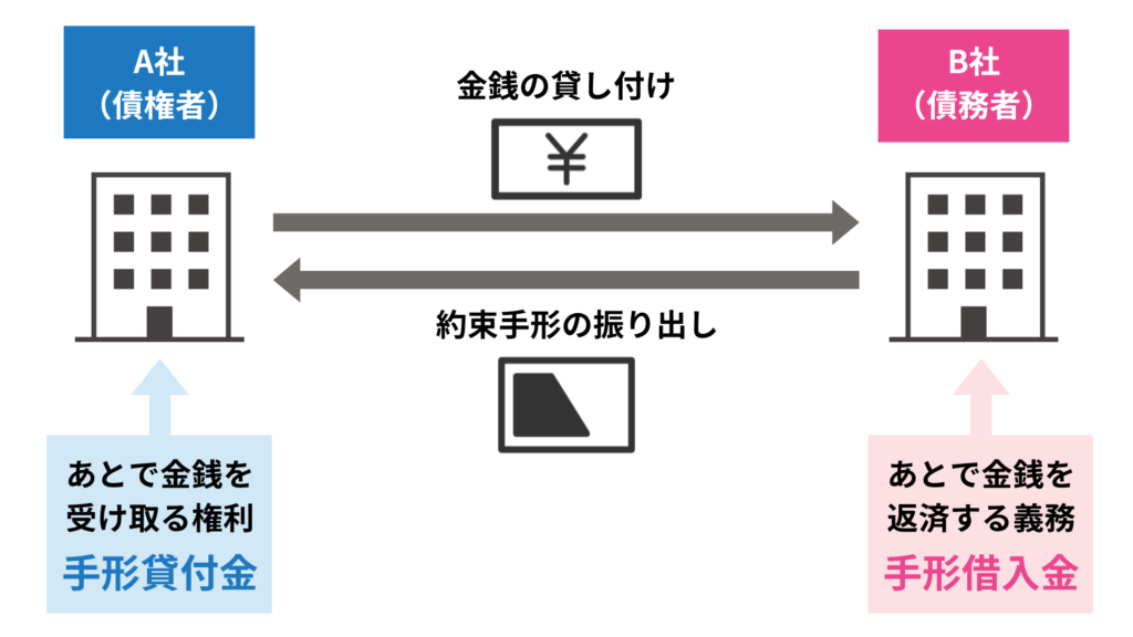 このときは、手形貸付金(資産)勘定や手形借入金勘定(負債)を使用して記入します。