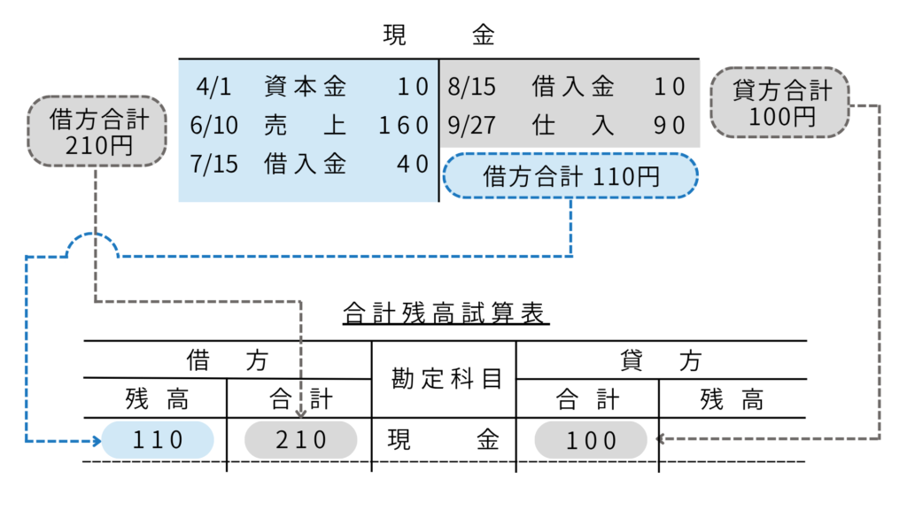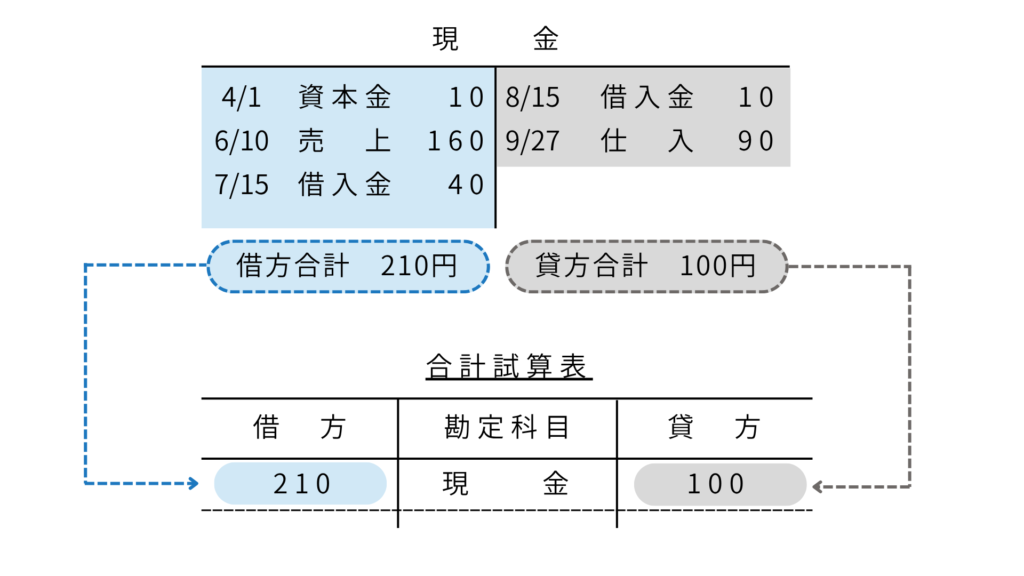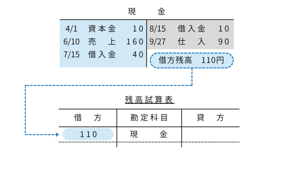 残高試算表ざんだかしさんひょうは、各勘定科目の借方と貸方の金額を比較し、その差額(残高)を集計します。
