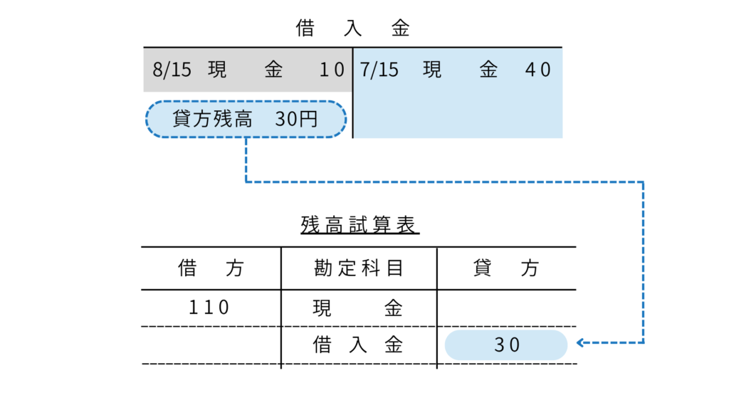 負債は借方残高になるので、残高試算表の貸方に記入します。