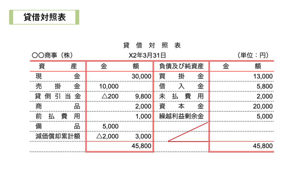 会社が一定時点(決算時点)でどれだけ資産や負債を保有しているのかを明らかにするために、借方に資産、貸方に負債と純資産を記入します。