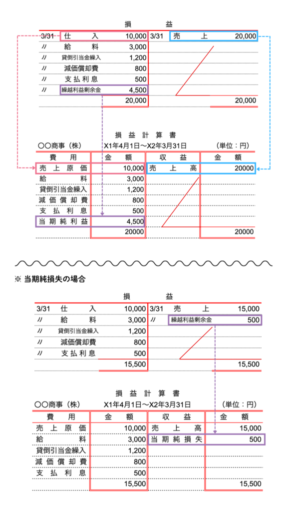 - 繰越利益剰余金は「当期純利益」と表記する。(※貸方の場合は「当期純損失」を貸方へ記入する。)