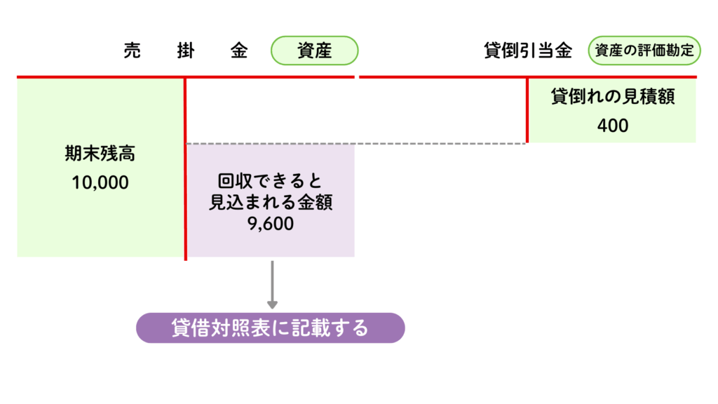 貸倒引当金は資産の評価勘定になります。資産の評価勘定とは、資産の金額を評価し直して、資産額を修正するための勘定科目です。資産の評価勘定を考慮することで、回収できると予想される金額に修正することができます。