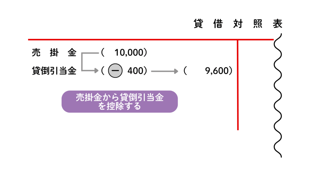 貸借対照表上は、売上債権の金額から貸倒引当金の金額を控除した額を記入します。
