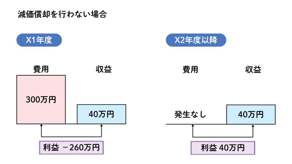 減価償却を実施しない場合、費用と収益の対応関係を図ることができません。このままでは費用と収益が対応していないので減価償却を実施します。