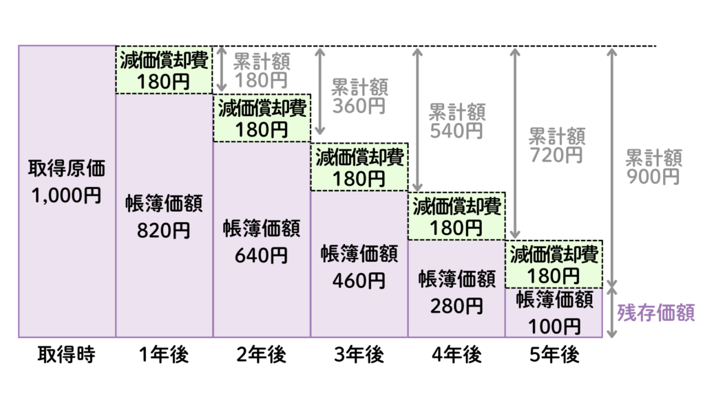 例えば、取得原価1,000円の固定資産を耐用年数5年で減価償却を行うと以下のようになります。ここでは、残存価額を取得原価の10%としています。